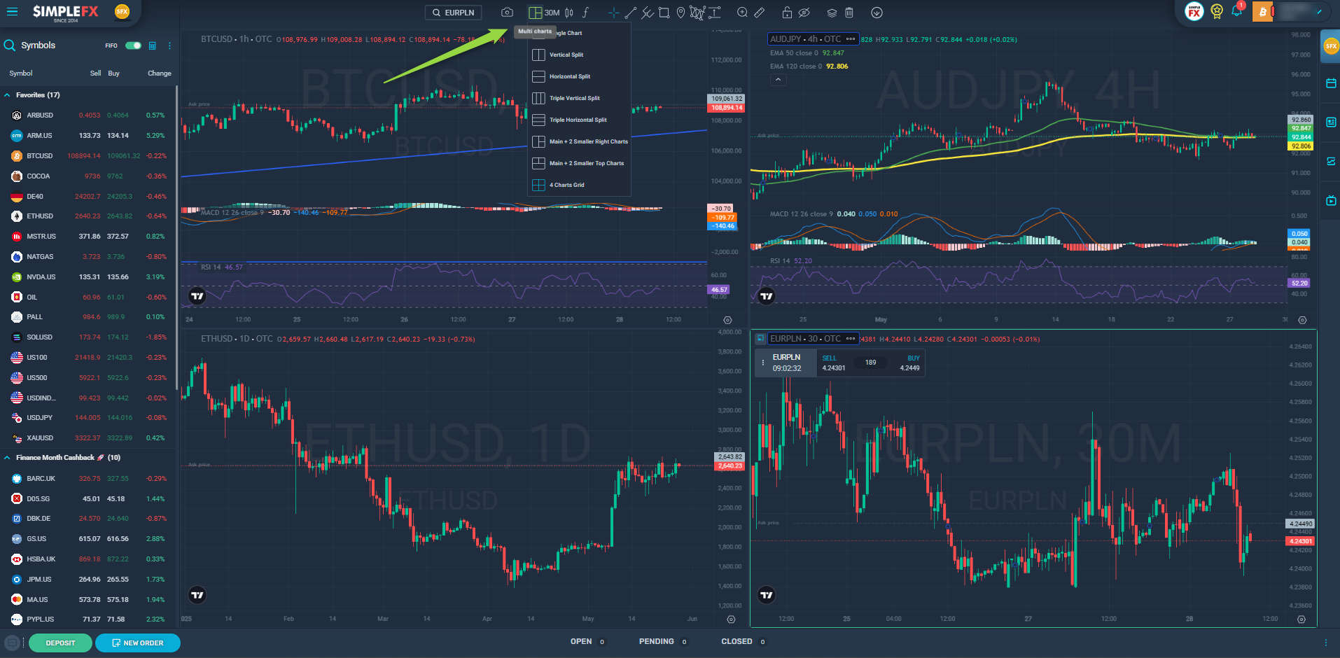 We’re excited to introduce Multicharts – a powerful new upgrade on the SimpleFX WebTrader platform. Whether you’re tracking crypto, forex, indices, or stocks, this feature gives you more insights and more flexibility.
