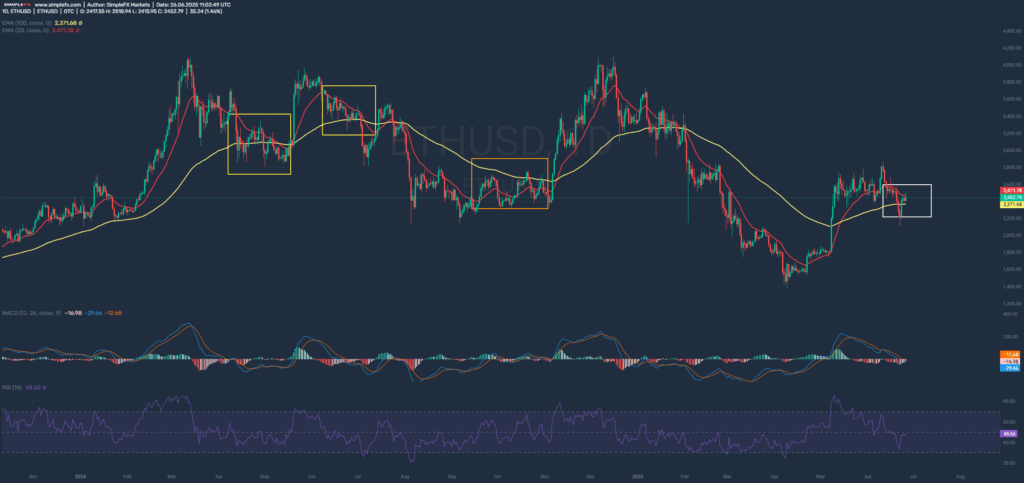 Let’s start with the explanation. The yellow line represents the 100-period exponential moving average (EMA100, also known as the long line), and the red line represents the 20-period exponential moving average (EMA20, also known as the short line). When the short line crosses the long one from above, it most often heralds price declines; otherwise, it might herald price increases.