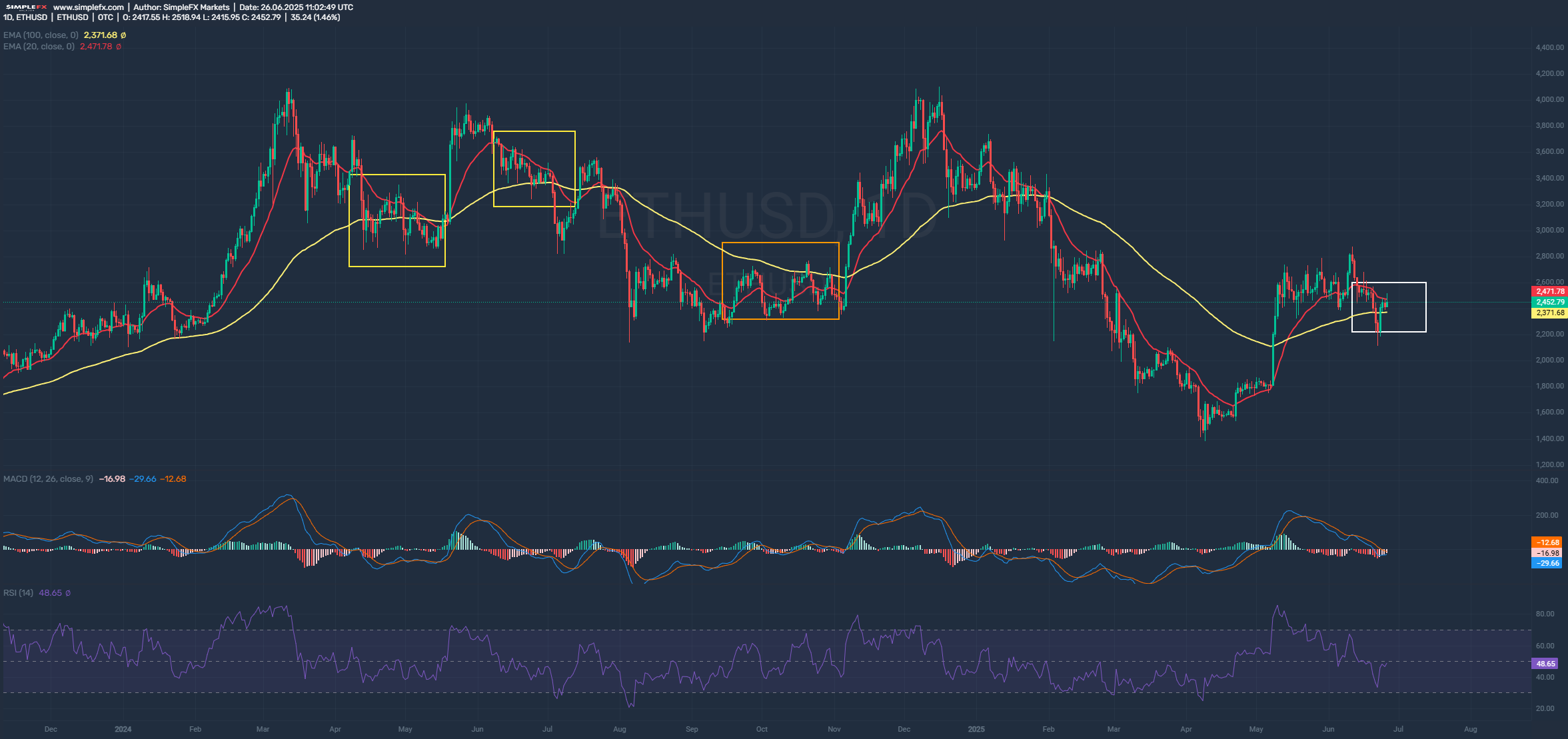 Currently, EMA20 > EMA100, which was also represented by the yellow rectangles. Will the price behave differently this time than historically?