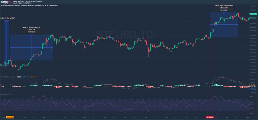 The data regarding the two previous years confirms the Bitcoin green trend. In 2023, BTCUSD started at $16,500 and finished the year above $42,000, for an over 150% increase in value. At the end of 2024, after the post-U.S. elections rally, Bitcoin reached over $93,000, earlier crossing the magical barrier of $100,000.